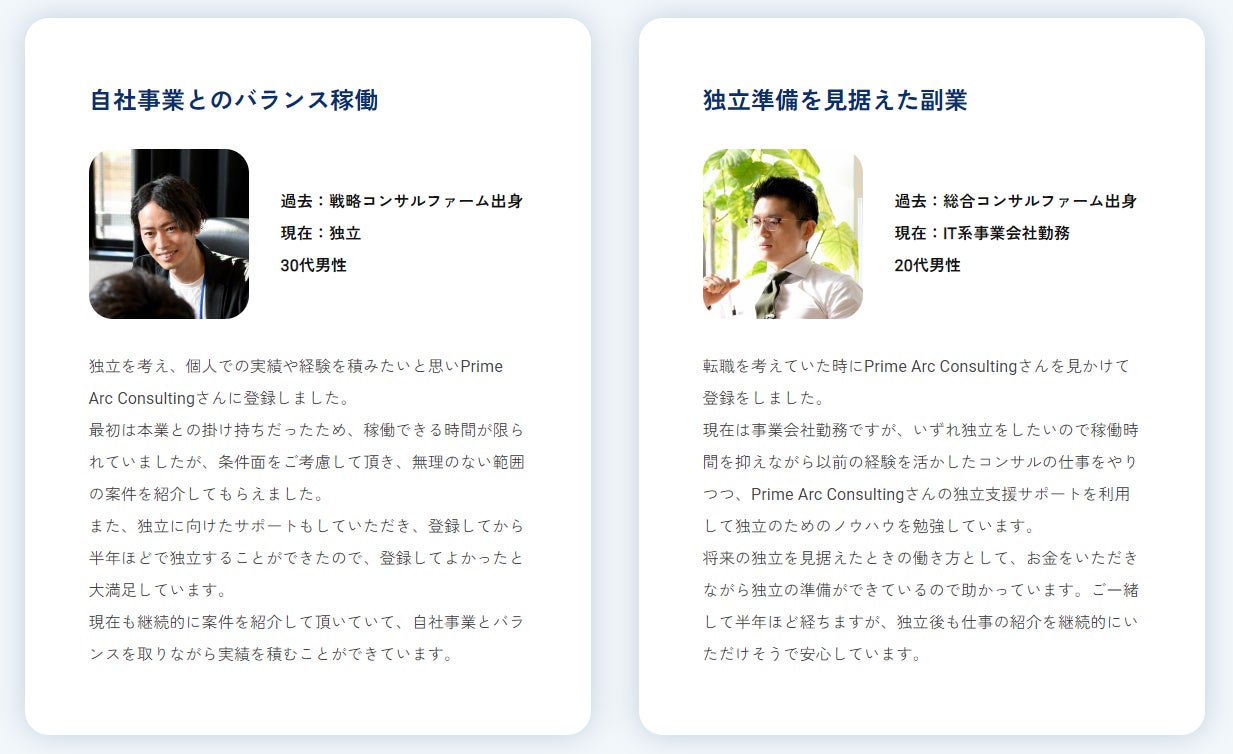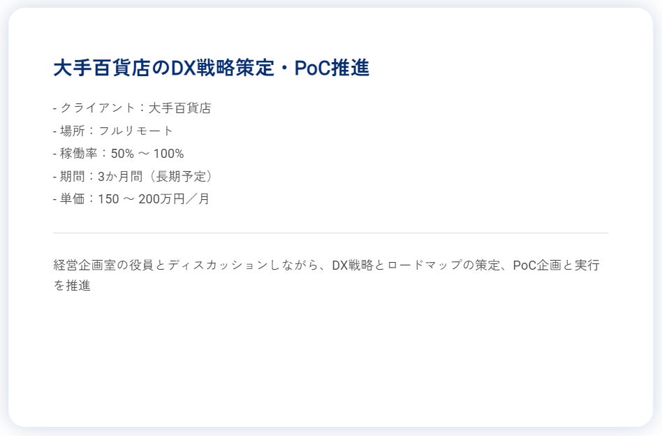 プロジェクト期間中、弊社コンサルタント(元大手コンサル企業マネージャー)がサポート致します。このため、初めての副業でも安心して参画ができます。大手コンサル企業勤務のコンサルタントも多数参画中!