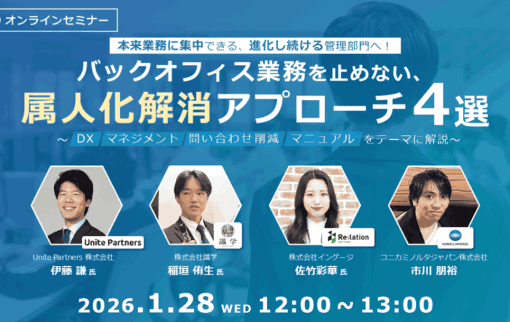 本来業務に集中できる、進化し続ける管理部門へ! バックオフィス業務を止めない、属人化解消アプローチ4選 ~DX/マネジメント/問い合わせ削減/マニュアルをテーマに解説~ 受付中 2026.1.28 12:00 - 13:00
